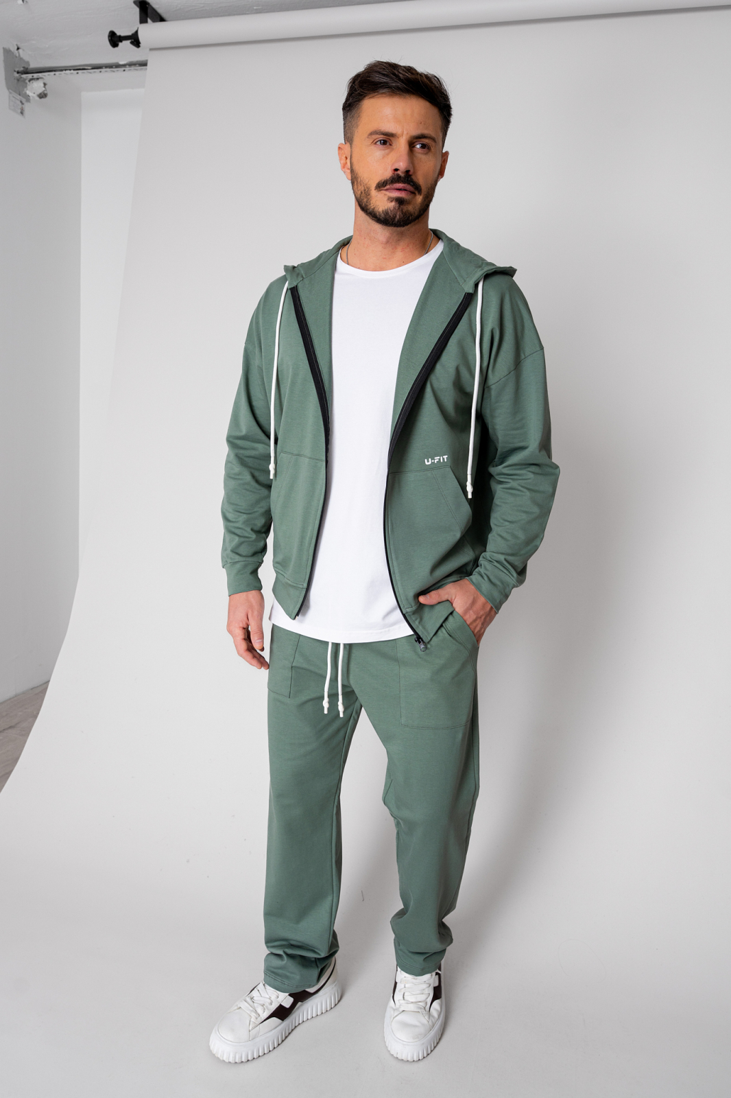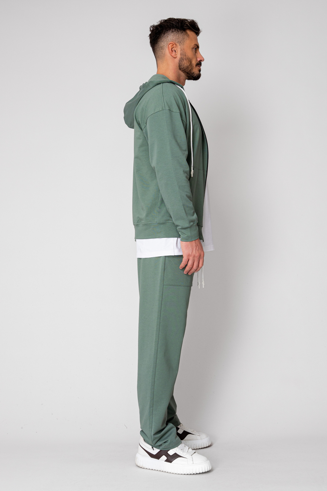 • Sweatshirt with zipper and hood, pouch pockets, drawstring at the hood