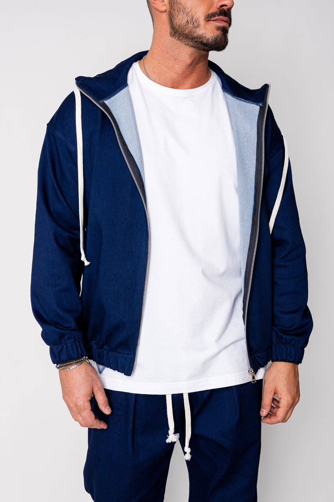 Set premium din denim strech, conceput pentru confort și stil fără efort. Țesătura denim elastică de înaltă calitate, cu compoziţie 71% bumbac, 27% poliester și 2% elastan, oferă durabilitate, flexibilitate și o potrivire plăcută pe corp. Croiala modernă cu hanorac cu fermoar metalic și pantalon lung cu elastic jos still Baggy creează un look urban, rafinat, ideal atât pentru ținute casual de zi cu zi, cât și pentru outfituri smart-relaxate. Denim-ul premium adaugă profunzime cromatică și textură, menținându-și forma și confortul chiar și după purtări repetate. Detaliile minimaliste și culoarea clasică Dark Blue îl fac ușor de asortat cu garderoba existentă.